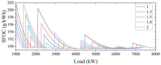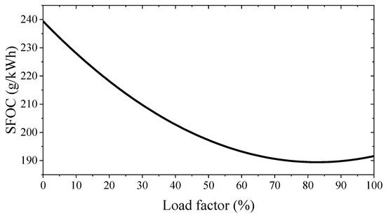 Figure 6 shows the specification fuel oil consumption curve (SFOC), which plots the consumption according to the load factor of the generator obtained using Equation (1). The SFOC curve shows that the fuel consumption is the lowest in the range of 80–85%.