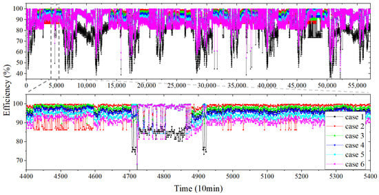 Efficiency for each case was derived based on Equation (3). Figure 10 shows the power generation efficiency for each case, and Table 6 shows the quartile of the efficiency for each case.