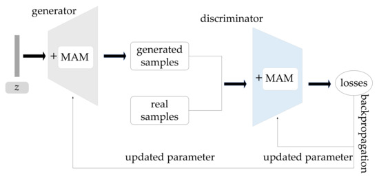 Attention mechanism was first developed as part of the encoder–decoder framework in RNN (Recurrent Neural Network) to encode lengthy input statements, and it has been widely used in RNN subsequently [24]. However, no matter how long the antecedent is and how much information it includes, it will finally be compressed into a vector of several hundred dimensions. This means that the larger the context, the more information will be lost from the final state vector. In CNN, the feature map was acted on the attention mechanism, trying to acquire available information in the feature map and achieve a better task effect [25]. “Attention is all you need” introduced the transformer model with self-attention as the basic unit [26], which makes the attention mechanism genuinely successful. The key of Squeeze-and-Excitation Networks (SENet) [27] is SE block, in which the interdependence between feature maps was explicitly modeled by an attention mechanism. The importance of each feature map is acquired adaptively through learning, and then, the original data are updated according to the matter. Han Zhang et al. proposed Self-Attention GAN (SAGAN) [28]. It adopted a non-local so that the network can effectively construct relationships between different regions. SAGAN considers the global information in each layer to solve unclear local details in tiny. In addition, it finds a good balance between increasing the receptive field and reducing the number of parameters. However, it ignores the relationship between the channels of the feature map, and many abnormal structures are presented in the generated images.