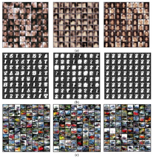 The baseline model in this paper is DCGAN. To verify the effectiveness of MA-GAN, the results are qualitatively and quantitatively compared with those of WGAN-GP and SAGAN that also use attention mechanisms. The common feature of these models is that DCGAN is their baseline method. These models have a simple structure and few parameters and only occupy a small GPU memory, so they can better verify the availability of the MA-GAN. For CelebA, it can be seen from Figure 7a, b that when the generator executes 100 times iteratively, the images generated by WGAN-GP and SAGAN still contain much noise. From Figure 7c, it can be seen that when the generator of MA-GAN executes 100 times iteratively, the outline of the human face has already been presented in the generated images. For the number 8 in MNIST, WGAN-GP, SAGAN, and MA-GAN all outline the number after the generators of these models execute 100 times. However, there are still irregular shapes in WGAN-GP and SAGAN. By contrast, the MA-GAN has a relatively stable performance, and there are not many abnormal structures in the generated images. For CIFAR-10, the images generated by the three models after 1000 iterations are challenging to distinguish with eyes, and there will be a quantitative evaluation later.
