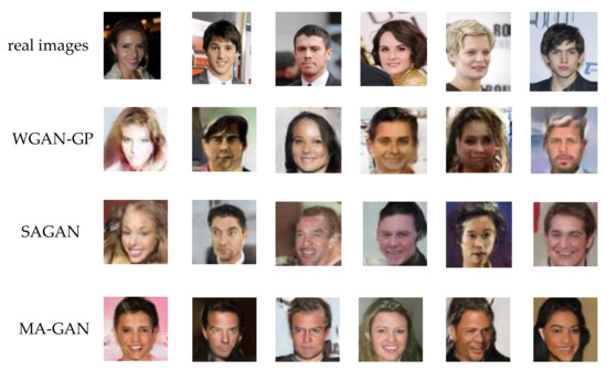 It can be seen from Table 8 that for CelebA, compared with WGAN-GP, the IS of MA-GAN is increased by 5.76% and that of SAGAN with the same attention mechanism is increased by 3.44%.