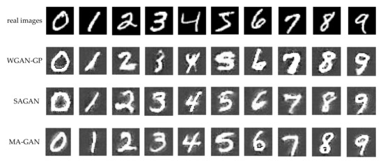 It can be seen from Figure 9 that the MA-GAN can generate relatively smooth images for complex handwritten numbers such as 2, 3, 5, and 8, and there is no noticeable noise in the generated images. However, abnormal structures can be observed in the images generated by WGAN-GP and SAGAN for the handwritten numbers 4, 5, and 8.