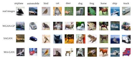 It can be seen from Figure 10 that there are apparent content and background segmentation in the images randomly generated by the MA-GAN. Meanwhile, it is difficult to distinguish the subjects in the images generated by WGAN-GP and SAGAN. By contrast, the images generated by MA-GAN can distinguish “aircraft”, “deer”, “trucks”, and other objects. In addition, the bright saturation of the colorful images is better than those generated by SAGAN. The images generated by WGAN-GP have much noise and different degrees of structural abnormalities on the objects such as “cats”, “frogs”, “ships”, and “trucks”, while these problems are rare in the MA-GAN.