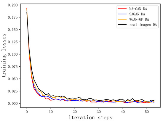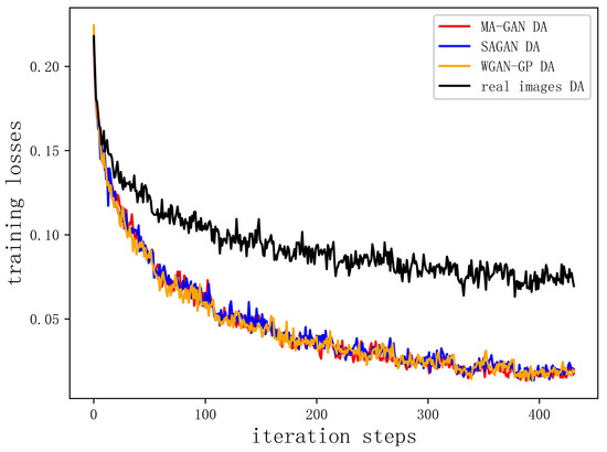 It can be seen from Figure 13 that under the same iteration steps, the training loss of the MA-GAN DA decreases the fastest, and the loss becomes stable after 400 iterations, indicating that the model converges easily. After real images augmentation, the training loss does not reduce as fast as that of the GAN DA.