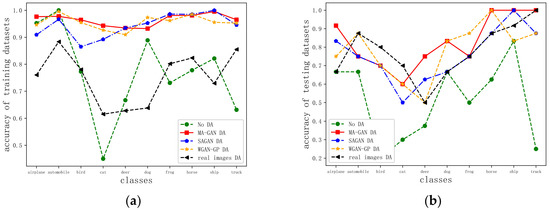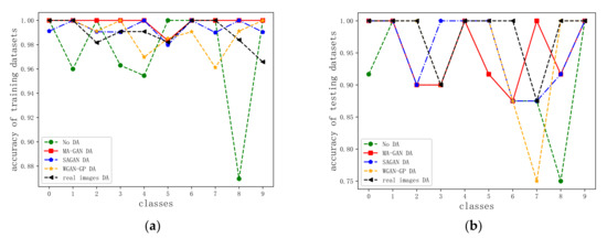 Figure 12 shows that without augmentation, the classification accuracy of each class in the training set and test set fluctuates the most. However, the WGAN-GP augmentation presents greater fluctuations than other methods. The classification accuracies of the classes with SAGAN augmentation and real images augmentation are equivalent, while that with MA-GAN augmentation shows the slightest fluctuation.