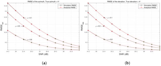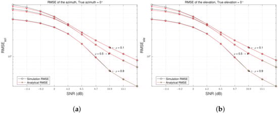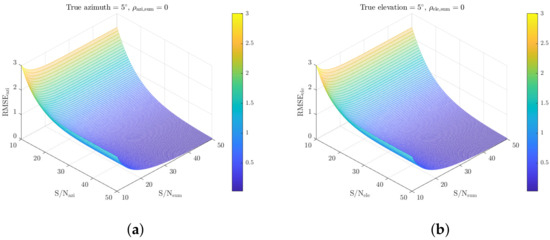 Figure 10, Figure 11 and Figure 12 show the result that the RMSE decreases as the correlation coefficient of the channel noise increases from negative to positive when the target’s azimuth and elevation are positive. On the other hand, in Figure 13, Figure 14 and Figure 15, when the azimuth and elevation of the target are negative, the RMSE decreases as the correlation coefficient of the channel noise decreases from positive to negative. In Figure 8, we find that the correlation coefficient of the channel noise changes from negative to positive when the noise source changes from negative to positive in the azimuth and elevation directions with respect to the boresight. Consequently, referring to the results of Figure 8 and Figure 10, Figure 11, Figure 12, Figure 13, Figure 14 and Figure 15, when the noise source and the target have the same sign in the azimuth and elevation directions, the RMSE decreases, and when the sign is different, the RMSE increases.