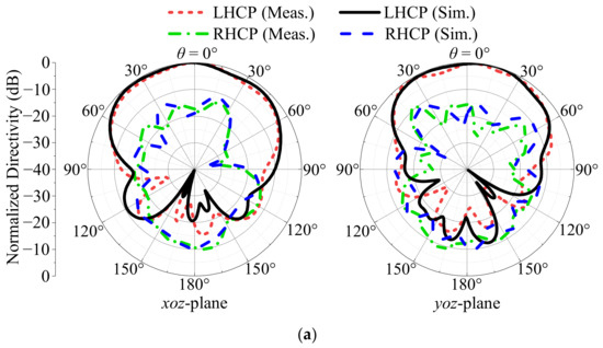 The measured and simulated radiation patterns at 27.5 GHz and 40 GHz are shown in Figure 11. The DRA has broadside unidirectional radiation patterns at both frequencies, generating LHCP in the +z-direction. Figure 12 shows measured, simulated and modified gains of the proposed DRA. It also can be seen that the modified results match the measured results. The measured average (peak) gains are 4.98 (5.62) dBic at the lower band and 5.76 (6.74) dBic at the upper band, while the modified simulated average gains are 5.35 dBic at the lower band and 6.18 dBic at the upper band.