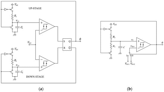 In a comparator-based relaxation oscillator, the oscillation is due to a capacitor being periodically charged and discharged by means of resistors (RC oscillators) [7] or constant current generators (I-C oscillators) [8]. However, the appealing properties of relaxation oscillators are typically traded off with lacking performances for their reliability: the frequency accuracy and stability are usually far from optimal, due to process–voltage–temperature (PVT) variations. For practical relaxation oscillator uses, the frequency inaccuracies can be partially relieved by means of a proper trimming, which might be executed as part of the fabrication process (as is performed for the internal oscillators of many low-cost microcontroller families, to compensate for process variations [9,10]) or even at operating time [11]. Moreover, regarding the supply voltage sensitivity, an on-chip regulator is most likely present in a system-on-chip (SoC), to provide a stable supply voltage to the oscillator and other sub-circuits. As an alternative to such standard approaches, design strategies specifically aimed at reducing the PVT sensitivity of the oscillation frequency have been proposed. To this purpose, a possible approach, proposed in [12], is to employ an I-C relaxation oscillator equipped with a process-compensated current reference. Promising results have been reported for the process sensitivity of the generated frequency; however, the choice of an I-C operating principle generally worsens the phase noise and jitter performances, due to the relevant noise contribution (both thermal and flicker) from the current reference itself.