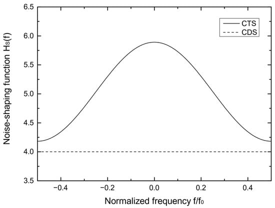 Noise-shaping function of the previously defined CTS, evaluated for α1 = 0.176, and of standard CDS.