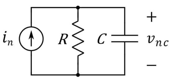 The two noise samples present in Equation (15) are uncorrelated, since they come from the thermal noise of different resistors. Their variance cannot be simply assumed to be equal to kT/C: the variance itself of each of the two vnc1,2(t) noise processes actually increases from the beginning of the corresponding oscillation half-period, starting from zero and indeed saturating to kT/C [15]. It is initially null because, under the assumption of a completely ideal comparator, at switching instants the capacitor voltage is deterministically equal to one of the comparator thresholds. Based on the equivalent noise circuit of Figure 3, where the resistor thermal noise is represented by the current generator in, such a variance can be found to be