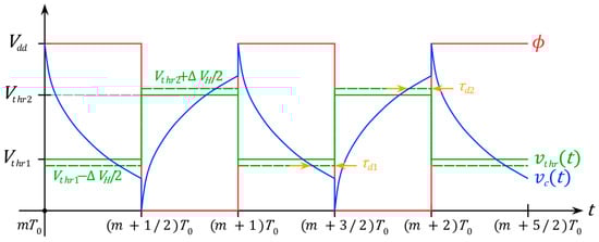 In these equations, the vn1,2(t) terms are effective noise processes, related to either the up or down stage of the oscillator. Such effective noise processes are defined based on the following consideration. In an ideally noise-less scenario, each comparator switching event occurs when the related capacitor voltage exactly reaches Vthr. In the presence of noise, instead, each switching event occurs with a timing uncertainty, due to a stochastic error affecting the comparator threshold. The stochastic threshold errors originate from noise sources within the circuit and can be treated as a referred-to-the-input effective noise process of the comparator. As indicated in Equation (9), the latter include contributions from the comparators threshold noise vn-comp1,2(t) itself and the RC-filtered thermal noise of the resistors vnc1,2(t). Equation (8) is attained assuming the deterministic component of the capacitor voltage waveform vc(t) to be linear around the comparator switching instants. Thereby, the period jitter can be simply expressed as the summation of sampled noise processes divided by the slope of vc(t) itself [30]. For the moment, the comparator hysteresis and delay are neglected in the analysis.