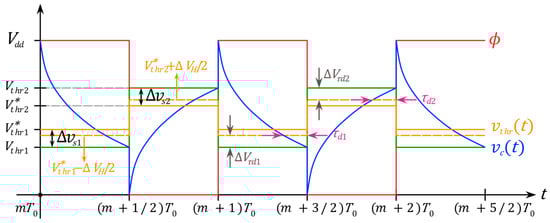 Since the oscillator core is the same as Figure 4, the ideal oscillation period is still given by Equation (18). However, to calculate the real oscillation period, the effective comparator thresholds can be expressed as in Equation (27), to account for their dynamic adjustment.