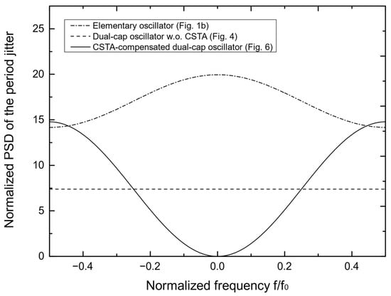 The dual-slope oscillator of Figure 4 is verified to apply standard CDS to the comparator noise. Through simple calculations, the comparator noise contribution to the period jitter PSD can be expressed as in Equation (12), with the topology-dependent coefficient being, in this case,