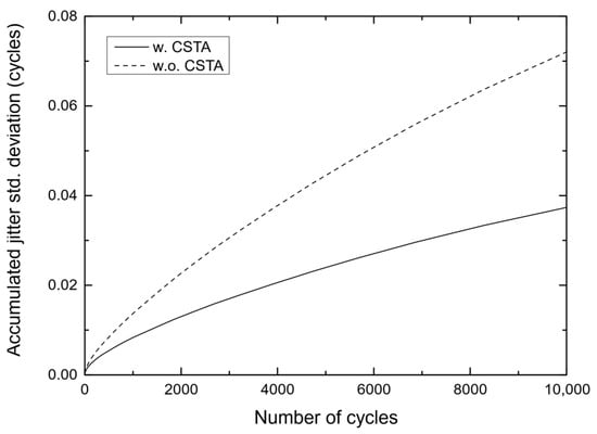 Figure 12 characterizes the jitter accumulation phenomenon, representing the standard deviation of the accumulated jitter as a function of the number of observed oscillation cycles. The CSTA-compensated oscillator presents a remarkable reduction of the jitter accumulated in the medium/long term (throughout 10k oscillation periods, the standard deviation of the accumulated jitter results to be lower than 4 ns).
