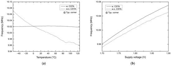 As for the sensitivity to the supply voltage, the uncompensated and CSTA oscillators present a quite similar performance, with a voltage sensitivity around 5%/V.