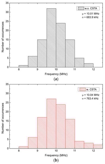The process sensitivity is also not improved by the proposed approach. We performed 100 Monte Carlo runs for both the uncompensated and the CSTA-compensated oscillators, including both global and local (mismatch) process errors. Figure 14a,b show the resulting histograms, characterizing the process spread of the oscillation frequency for the basic oscillator and the compensated one, respectively.
