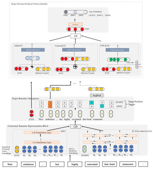 Fine-grained sentiment polarity analysis from unstructured text is an essential task in automatic public opinions detection and consumer reviews attitude recognition. In general, aspect-based sentiment analysis (ABSA) has been a focus of research in recent years. Aspect-based sentiment analysis [3], which identifies people’s opinions on specific topics, is an extraction and classification fused problem in natural language processing (NLP). Various ABSA works focus on the sentiment polarity (positive, neutral, and negative) of a target word in given comments or reviews [4,5]. For example, in the restaurant service scenario, “Niceambience, but the highly overratedfast-food restaurant.”, the consumer mentions two opinion targets, namely “ambience” and “fast-food restaurant”, and expresses a positive attitude toward the first one, and negative sentiment toward the second one.