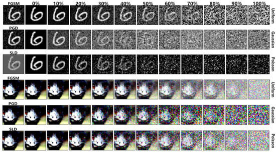 Example images with various amplitude noises. Rows 1, 2 and 3 were for MNIST, and rows 4, 5 and 6 were for CIFAR-10. The first column images were images with the FGSM, PGD and SLD attacks, respectively. The images in rows 1, 2, 3 or 4, 5, 6 were images with Uniform noise, Gaussian Noise, and Poisson noise, respectively.