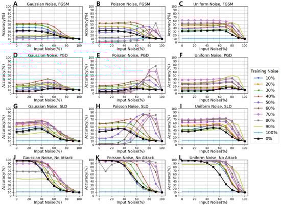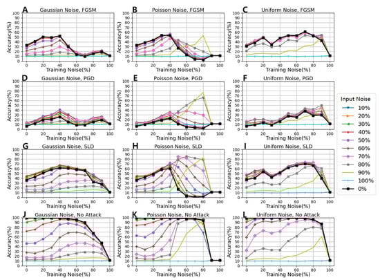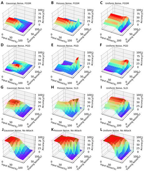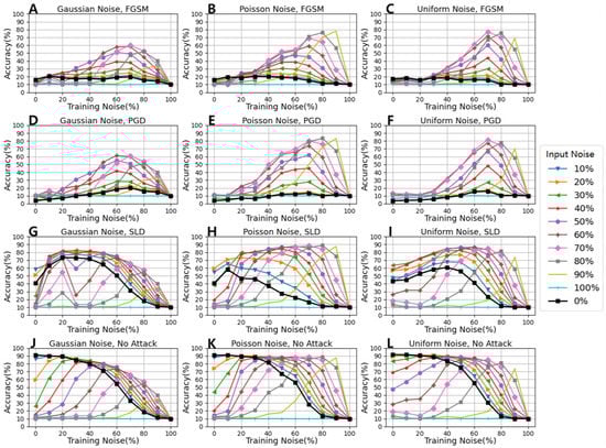 - Under the FGSM attack condition, the model accuracy was improved when adding training noise ranging from 0% to 80% amplitude. Under the PGD attack condition, adding training noise in almost all amplitude intervals improved the model accuracy. Under the SLD attack condition, except adding 100% amplitude training noise, the model accuracy was improved in all cases (see Figure 4);