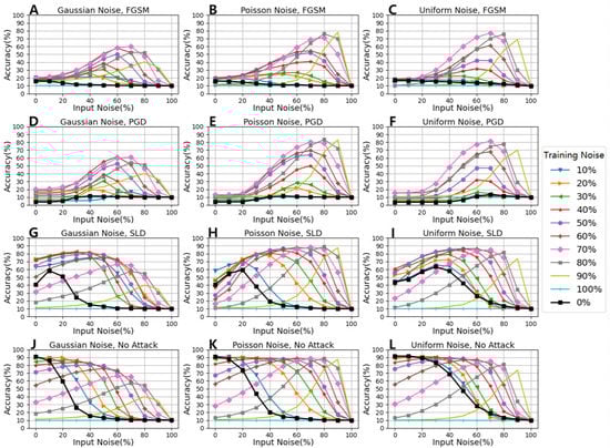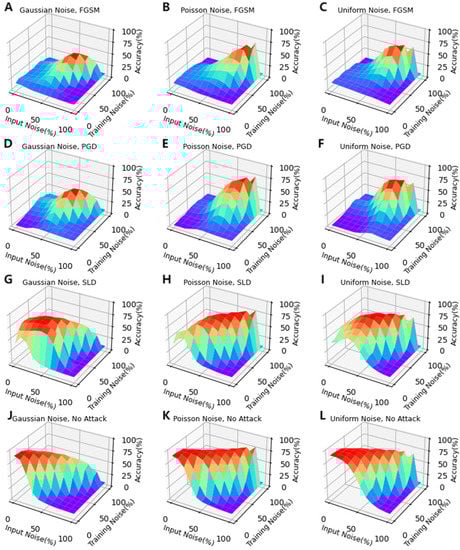- The accuracy values dropped from over 90% to about 40% under the condition of the SLD attack, while the accuracy of the model improved to 85% with the NFM. Among them, the defense effect of the NFM under a condition of Poisson noise and Uniform noise was the best (see Figure 5G–I,L).