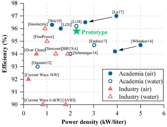 Overview of the state-of-the-art and prototype on-board chargers in terms of efficiency and power density. The shape of the symbol indicates the use of air- or water-cooling.