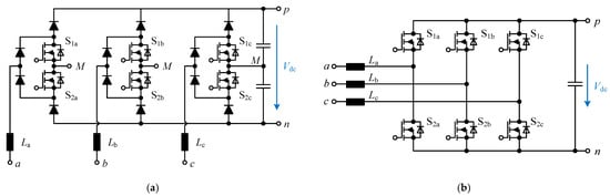 Considered topologies for the ac/dc stage: (a) Vienna rectifier; (b) active six-switch boost-type (6S-Boost) PFC rectifier.