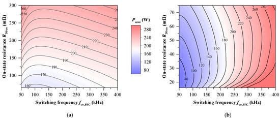 Distribution of the total semiconductor losses Psemi versus the switching frequency fsw,PFC and the drain-source on-resistance RDSon of the SiC MOSFET for (a) the Vienna topology with LPFC = 60 μH (including mains and freewheeling diodes) and (b) the 6S-Boost topology with LPFC = 120 μH.