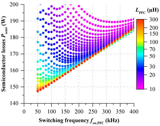 Although the loss consideration for the B6-Boost topology indicates lower semiconductor losses for fsw,PFC < 150 kHz, the size and weight of the PFC inductor and heatsink also have to be taken into account in the design of the portable demonstrator. Due to the two-fold lower inductance and the expected lower EMI noise, the Vienna topology is analyzed in more detail regarding the selection of the MOSFET and the optimization of the inductor. Based on the calculated total semiconductor losses Psemi in Figure 3a, a MOSFET with a chip size as large as possible, with low on-state resistance, respectively, should be selected. According to Table 2 and the available types of 900 V SiC MOSFETs from Wolfspeed, a 65 mΩ device (C3M0065090J) is chosen for the following considerations. To further narrow down the two parameters, switching frequency fsw,PFC and inductance LPFC, Figure 4 shows the total semiconductor losses for the selected 65 mΩ SiC MOSFET, including the losses in the mains side and freewheeling diodes. The calculated configurations are plotted versus fsw,PFC and the data points are color-coded with logarithmically distributed values of the PFC inductance. With increasing values of LPFC, the semiconductor losses Psemi decrease and reach their minimum at the low switching frequency. Moreover, for values LPFC > 150 µH, equal semiconductor losses can be achieved with different coil configurations, which can be observed by the superimposed arrangement of the mentioned configurations behind the red operating points for LPFC = 300 µH. As a result, the semiconductor losses are mainly determined by the conduction losses due to the high value of LPFC and the dynamic losses at the turn-on instants and turn-off instants, respectively, of the SiC MOSFET, which hardly differ, for the two different inductance values of the PFC coil. Therefore, from the perspective of circuit analysis, the inductance should be selected as high as possible, while at the same time the switching frequency should be low.