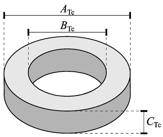 Following the suggestion of the preceding topology analysis, to realize the highest possible PFC inductance at a low switching frequency, the process of calculating and optimizing the coil is presented next. Based on analytical calculations, extensive parameter studies are carried out with the aim of determining a Pareto optimum for the power dissipation occurring during operation as a function of the volume of the component and the switching frequency of the PFC. First, the performance of different metal powder-based core materials was compared (Kool Mµ, MPP, High Flux), whereby High Flux turned out to be the most suitable material composition in terms of permeability and losses. For the optimization, a toroidal shape is chosen as the core geometry, which is shown in Figure 5 with the necessary geometrically designations for the following analytical calculation.