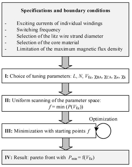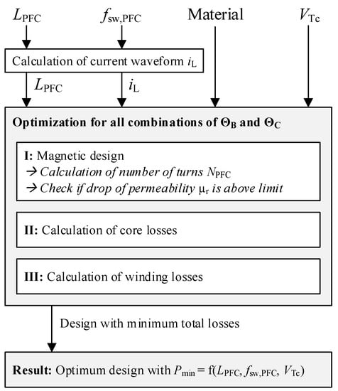 The flowchart describing the optimization strategy for the PFC inductance is shown in Figure 6. Utilizing the data of the operating point of the PFC from Section 3.1, the progression of the coil current iL(t) is calculated by setting LPFC and fsw,PFC. With the material data and a specified volume VTc, the core and winding losses in the component are calculated for all combinations of ΘB and ΘC. As a result of this optimization, the optimal coil design is obtained depending on its volume and the selected operating point, which further leads to the representation of a Pareto frontier based on the respective parameter.