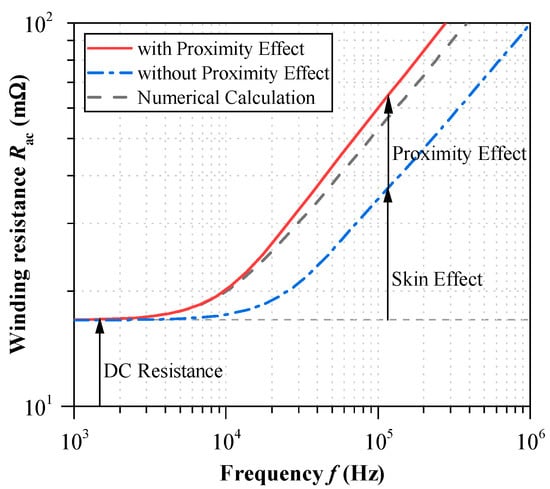 Frequency-dependent resistance Rac(f) of the winding for NPFC = 27 calculated using an analytical approach and numerical method.