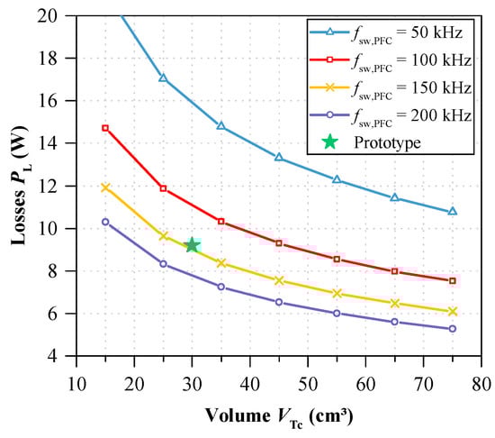 Loss PL versus volume VTc of the PFC coil for different selected switching frequencies fsw,PFC.