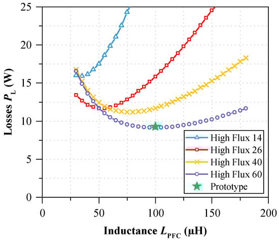 Based on the selection of switching frequency and volume, Figure 11 shows the calculated losses for VL = 30 cm³ and fsw,PFC = 140 kHz as a function of the inductance LPFC for different core materials. The core losses increase for the decreasing inductance values, whereas the proportion of winding losses in the total losses increases with the rising inductance values. Following the power dissipation curve for the material “High Flux 60” in Figure 11 to the local minimum, results in an inductance of LPFC = 100 µH for the selected volume and switching frequency. In Table 5, the parameters and results of the chosen optimized PFC coil from Figure 11 and the built prototype are summarized. Due to the availability of a core geometry very similar to the optimal design, the values taken from the Pareto frontier are very well met by the realized prototype, which is shown in Figure 12.