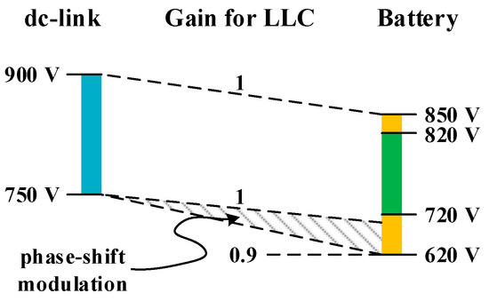 at the three-phase mains, the minimum dc-link voltage is about 750 V considering a 10% tolerance of the mains voltage. Thus, the maximum dc-link voltage variation results in 750–900 V using 650 V rated boost diodes in the Vienna rectifier and two stacked 500 V dc-link capacitors. The dc-link and battery voltage range are shown in Figure 14, together with the selected gain M = (n VBatt)/Vdc = 1 of the LLC converter. With a transformer turns ratio of n = 1.06:1, the converter operates at unity gain within the nominal battery voltage range of 720–820 V. By varying the dc-link voltage accordingly, the switching frequency of the LLC converter stays near fsr, which maximizes efficiency. Below the nominal battery voltage range and near the defined end-of-discharge voltage at 620 V, a phase-shift modulation method can be applied. Above the nominal voltage range, the LLC converter operates with unity gain up to the end-of-charge voltage VBatt = 850 V with Vdc = 900 V.