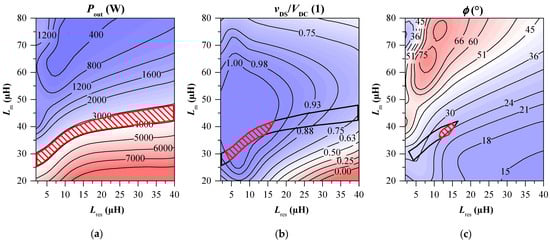 Thus, the efficiency of the converter decreases for switching frequencies, which deviate significantly from the resonant frequency []; at constant dc-link voltage, this applies to wide ranges of the battery voltage. For this reason, a system concept with variable dc-link voltage is implemented [,], which offers the possibility of reducing the switching frequency range considerably. Due to the maximum rectified voltage of