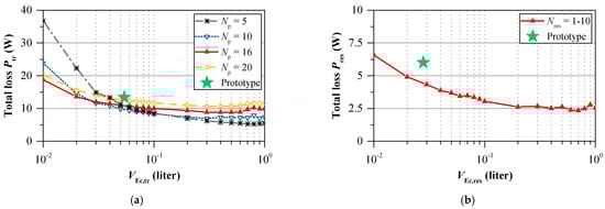 To validate the analytical approach for the calculation of the winding losses, these losses are additionally determined by a numerical calculation using the finite element method (FEM). The comparison of both results in Figure 9 shows that the analytically calculated solution predicts higher losses in the winding because the influence of eddy currents occurring in the turns is neglected in the calculation of the magnetic field. Utilizing the described calculation methods, extensive parameter studies are carried out to optimize the geometry, the winding, and the core material of the PFC inductance, with the parameter space considered being summarized in Table 4. As a result, in Figure 10, the total losses versus volume VTc of the PFC inductor is depicted for different switching frequencies. For each of the plotted data points, all remaining parameters listed in Table 4 are selected to achieve the lowest possible losses and, consequently, Figure 10 illustrates the Pareto optimum of the design at different volumes and switching frequencies. According to the presented results, efficient designs can be realized with increasing volume due to decreasing losses. Since small volumes additionally impose higher demands on thermal management due to increasing power loss density, the minimum volume of the component is limited due to its maximum heat dissipation. Furthermore, the losses also decrease with increasing switching frequency, so higher switching frequencies can contribute to a reduction in the required volume of the PFC inductor. Considering the recommendation made from the perspective of circuit analysis for the selection of inductance and switching frequency in Section 3.1 regarding semiconductor losses and EMC behavior, the switching frequency is set to 140 kHz, as higher frequencies cause only a small reduction in the losses. The volume of the coil is selected at around 30 cm³, as the expected losses in the range of 10 W lead to a power loss density in the range of 0.3 W/cm³, which is thermally manageable.