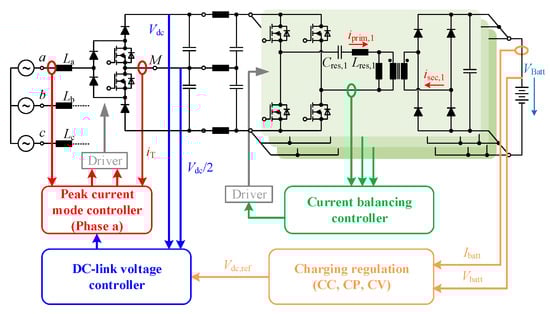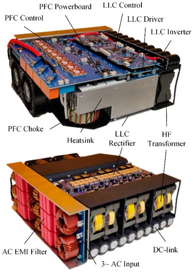 The number of available plug-in hybrid electric vehicles (PHEVs) and battery electric vehicles (BEVs) on the market, known commonly as electric vehicles (EVs), has increased significantly in recent years due to the superior properties of the electric powertrain [], rising fuel costs, and increasing restrictions on the global emission of greenhouse gases [,]. All popular EVs are equipped with level-2 conductive on-board chargers (OBCs), which enable the vehicle battery to be recharged at any AC outlet when the car is not in use or at home during the night []. As one of the important components in EVs besides battery and powertrain, the performance of OBCs is continuously improved by academia and industry. In the literature, there are various approaches to maximizing system efficiency and minimizing the volume of future OBCs [,,,,,,,]. Besides efficient and compact charging solutions, the integration of the auxiliary power module (APM) for the auxiliary battery is becoming more and more important to save costs and construction space []. On the part of the automobile manufacturers, the first generation of OBCs is in use, while the second advanced generation is under development or about to be launched in the next generation of EVs [,,,,,,,]. Due to the expected high numbers of units, the upcoming OBCs will be further optimized in terms of construction space, reliability, and especially costs.