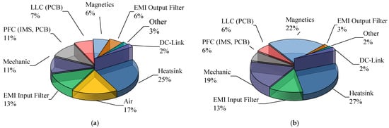A commonly published approach to reduce the size of passive components is to increase the switching frequency [,]; however, this leads to rising losses in the active devices for hard switching topologies. To minimize the power loss density with increasing switching frequency, the semiconductors must be optimized with regard to technology (Si, SiC, GaN), figure-of-merit (FOM) of the applied device, and packaging. The inductive components must be optimized concerning design, winding structure, and selection of the core material. To maximize the system’s performance, the maximum permissible power loss density of the semiconductors and the inductive components must be reached at the nominal operating point of the charger. In general, this maximum power density is linked to a maximum operating temperature of the components, which is determined by the applied cooling solution. Therefore, the optimum of the system design for the portable charger regarding efficiency and power density results at the intersection with the boundary conditions of the heatsink given by cooler performance and size. Although approaches with simplified calculation methods provide quick solutions, the results are subject to considerable uncertainty. Therefore, accurate models of power semiconductors [] and inductive components [] are needed to determine the losses over a wide frequency range. Using these models, together with the procedures for creating a virtual prototype, the optimum between system volume and efficiency can be evaluated for different topologies, technologies, and materials.