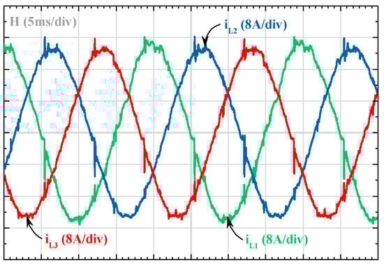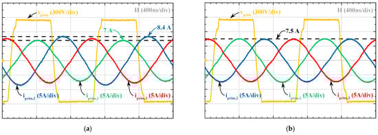 Experimental waveforms of three-phase operation of the dc/dc stage with 800 V battery voltage and full load (Pac = 11 kW) with (a) symmetry control inactive and (b) symmetry control active.