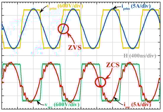 The measured key waveforms of the LLC resonant converter are shown in Figure 26 at full load and with an 800 V battery voltage. In Figure 26, vprim and iprim are the input voltage and input current of the resonant tank, respectively, vsec and isec are the output voltage and output current of the transformer on the secondary. The primary inverter switches turn-on at negative iprim and thus achieves ZVS. By selecting the operating point slightly below the series resonance, the secondary-side resonant current isec becomes zero before the end of the switching period and the rectifier diodes turn off under the ZCS conditions.