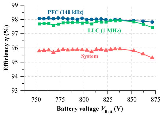 Measured efficiency of the Vienna PFC, the three-phase LLC resonant converter, and the entire system under full load.