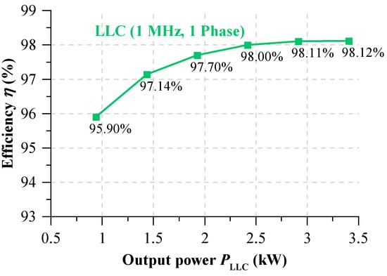 Measured efficiency of a single phase of the LLC resonant converter plotted versus the output power at 800 V battery voltage and driving of the primary inverter switches with a fixed 50% duty cycle.