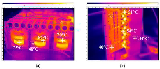 Thermal image of the prototype operating at full load. (a) View on hf transformers; (b) view on secondary-side rectifier.
