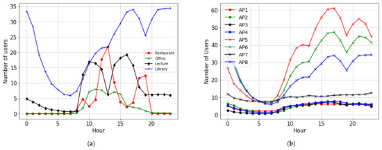 The spatiotemporal characteristics of the traffic are heterogeneous in terms of the AP-level. Figure 1 shows the changing number of users collected from the APs installed on the campus of Pusan National University (PNU) located in Pusan, South Korea. Figure 1a shows the changing number of sessions over time upon selecting an AP from different buildings. Each AP has a different pattern for the number of users. In the restaurant, the number of users increases at mealtime. In the office, users associate the Wi-Fi system during daytime except for lunchtime. In the lecture building, the pattern of the number of users is similar to that of the office, but the volume of the pattern is large. The library has more users at night than during the daytime. Figure 1b shows the changing number of users over time for all APs placed on a floor in the library. All APs have similar patterns, but the volume difference between the APs is significant. APs 5, 6, and 8 have a pattern in which the number of users changes considerably and the number of users falls at mealtime. The remaining APs have less variations in their number of users. Upon examining the Wi-Fi system at the AP level, the heterogeneity of the spatiotemporal characteristics can be observed.