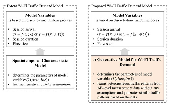 Deep learning can be used to represent heterogeneous patterns. In particular, the generative model learns the patterns of the input and produces samples similar to the input [5,6,7]. Therefore, this study proposes a generative model for Wi-Fi traffic demand by employing machine learning. This model possesses spatiotemporal characteristics. Wi-Fi traffic pattern changes over time and varies from site to site. Each site has a different traffic volume depending on the purpose of site. A difference in the traffic volume between the APs was observed even on the same site depending on the location of the AP within one site and the usage of the installed site. Figure 2 shows the distinction between our proposal and extent studies. Existing traffic demand models are divided into determining model variables based on a discrete-time random process and the spatiotemporal characteristic model. This study replaces the spatiotemporal characteristic model with the spatiotemporal characteristic generative model.