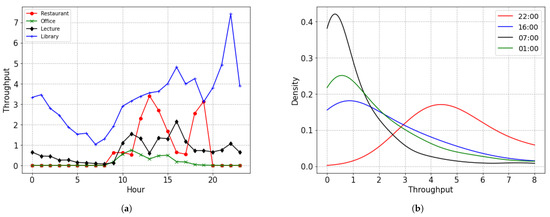 The throughput at 22:00 is close to a normal distribution with a high average. Figure 4a shows the change in the throughput over time for different buildings. The throughput pattern is similar to the pattern of the number of users, as shown in Figure 1a. Accordingly, the throughput is modeled to change the rate over time, such as the number of connected people.