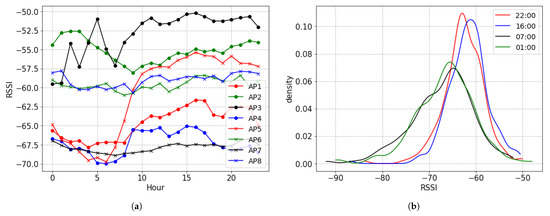 Heterogeneity of the RSSI. (a) Change in the RSSI with time for AP selections from different buildings. The RSSI does not have the same periodicity over the day as the throughput. Rather, the RSSI values are similar at all times. This implies that it has a more significant influence on the position of the STA than user concentration. (b) Densities for an AP in a library at different times. It follows a normal distribution.