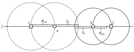To determine whether APs i and j interfere each other, STAs x and y associated with APs i and j, respectively, are virtually created, as shown in Figure 6. Let the straight line connecting the APs i and j be L. The virtual STAs are placed at the point where the communication range of the two APs meets the straight line L. If is larger than , the two links and interfere with each other. Therefore, this model determines that AP i and j interfere with each other.