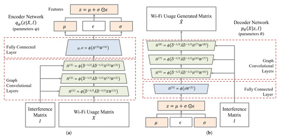 Variational graph autoencoder: (a) encoder, (b) decoder. The encoder network encodes the spatial features of Wi-Fi usage patterns into latent variables z. The decoder network generates Wi-Fi usage patterns from the latent variables z.