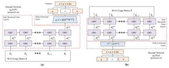 Variational recurrent autoencoder: (a) encoder, (b) decoder. The encoder network encodes the temporal features of Wi-Fi usage patterns into latent variables z. The decoder network generates Wi-Fi usage patterns from the latent variables z.